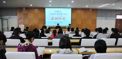 10月21日下午,我校“文明修身工程”启动仪式暨第二届大学生“读书节”开幕式在西主7楼学术报告厅举行。校团委书记黄伟中在启动仪式上作动员讲话,校团委副书记李秀梅主持启动仪式,校团委冯占元老师宣读了《2009年“文明修身工程”实施方案》。各学院、各校级学生组织团学干部代表近200人参加了仪式。