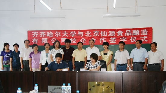 副校长郑喜群与北京仙源食品有限公司总经理喻顺珍在《齐齐哈尔大学与北京仙源食品有限公司校企合作协议》文本上签字。