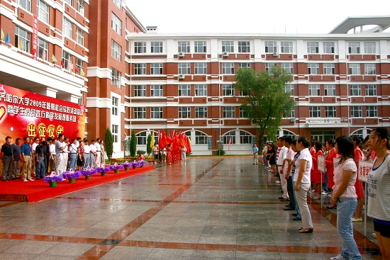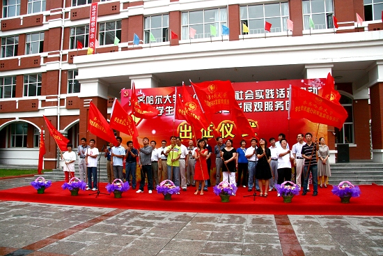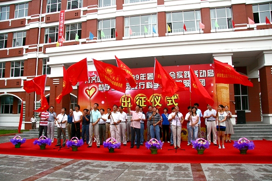 为庆祝新中国成立60周年,贯彻落实胡锦涛总书记5月2日在中国农业大学重要讲话中“把深入实践作为成长成才的必由之路”的号召,根据教育部“我爱我的祖国”主题教育活动的工作部署和团中央、团省委关于开展2009年度大中专学生志愿者暑期文化科技卫生“三下乡”社会实践活动的文件精神,结合我校正在进行的深入学习实践科学发展观活动,按照《关于转发党委组织部、校团委< 关于继续深入开展暑期社会实践活动的通知>的通知》(齐大党办字[2009]2号)的部署和安排,我校“2009年暑期社会实践活动启动暨学生党员践行科学发展观服务团出征仪式”于7月13日下午在中区主楼门前隆重举行。