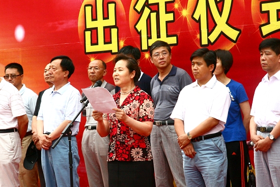校党委副书记王凤琴在仪式上讲话。她指出:社会实践是加强和改进大学生思想政治教育的重要途径,也是实现学校教育与社会教育接轨、促进学生成人成才的桥梁。近年来,我们紧紧把握社会发展的脉搏和青年学生的成才需要,以暑期"三下乡"社会实践活动为载体,采取校内与校外结合、集中与分散结合的形式,以了解国情、增长知识、服务社会为主要内容,开展了一系列主题鲜明、卓有成效的实践活动,逐渐实现了大学生社会实践活动的制度化、基地化和常态化。学校每年都有百支实践团队、万名学生奔赴全省乃至全国各地,深入农村、厂矿、企业、学校调查研究,接触实际,服务地方经济社会建设。特别是在北京奥运会、哈尔滨大冬会和抗震救灾等重大活动中,同学们以实际行动展示了齐大学子爱国爱校、奋发向上、不畏艰险、无私奉献的良好风貌和青春风采。2004年至今,学校三次被中宣部、教育部、团中央等五部委联合授予“全国大中专学生暑期‘三下乡’社会实践先进单位”光荣称号。去年,我校学生“赴四川地震灾区服务团“被评为黑龙江省优秀社会实践服务团队。如今,社会实践已成为我校青年学生受教育、长才干、做贡献,成长成才的品牌活动。