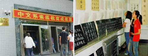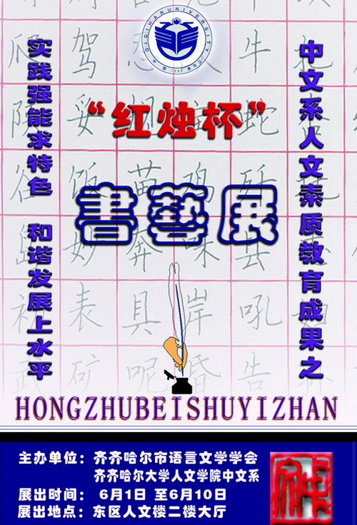 6月1日,人文学院中文系与齐齐哈尔市语言文学学会在东区人文楼二楼大厅联合举办素质教育成果展之“红烛杯”书艺作品展。本次展出集中展示人文学院中文系素质教育成果,是该系深入学习实践科学发展观,彰显中文专业特色,推动人文素质教育上水平、创特色的重要举措,激发了广大学生实践创新、苦练基本功的热情,吸引广大师生驻足浏览与欣赏。