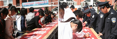校学生会主席刘琪同学主持了启动仪式。校保卫处处长王炜宣布启动仪式开始,保卫处副处长郭金林、付建成、校团委副书记李秀梅等为学生代表颁发了消防知识宣传资料,并和学生代表一同在条幅上签名,参观题了为“关注消防、珍爱生命、共享平安”的普及《消防法》宣传图片展。