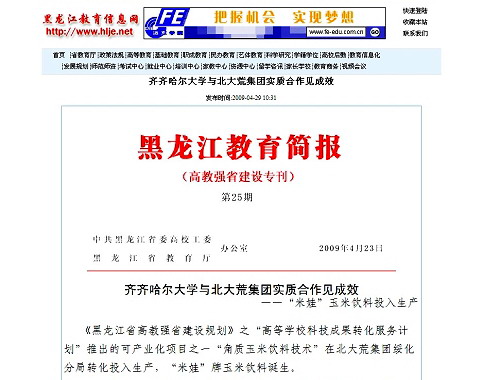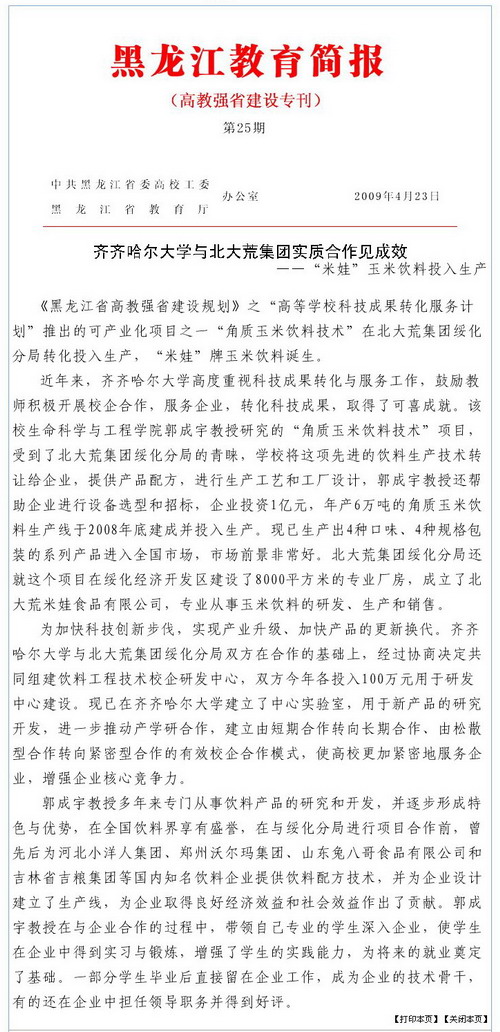 编者按:4月23日,黑龙江教育简报(高教强省专刊)第25期,以《齐齐哈尔大学与北大荒集团实质合作见成效》为题,专题刊发了我校生命科学与工程学院郭成宇教授研究的“角质玉米饮料技术”项目转化的可喜成就。省委高校工委书记、省教育厅长张永洲做了“项目很好,要有雄心支持企业做的更大更强,形成大产业。成果转化政策,请学校帮助这位老师关注,争取落实;要加强这类典型的宣传力度。”的重要批示。现将黑龙江教育简报第25期全文刊发,并对郭成宇教授的先进事迹作以报道。