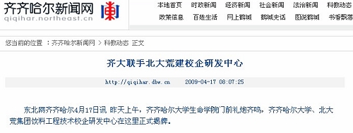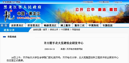 4月19日,齐齐哈尔市人民政府网站“中国.齐齐哈尔”、黑龙江省人民政府网站“中国.黑龙江”分别转载了《齐大联手北大荒建校企研发中心》这篇报道,产生了积极而广泛的影响。