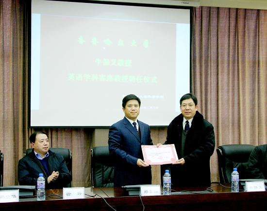 我校副校长郑喜群教授向牛保义教授颁发齐齐哈尔大学客座教授聘书。
