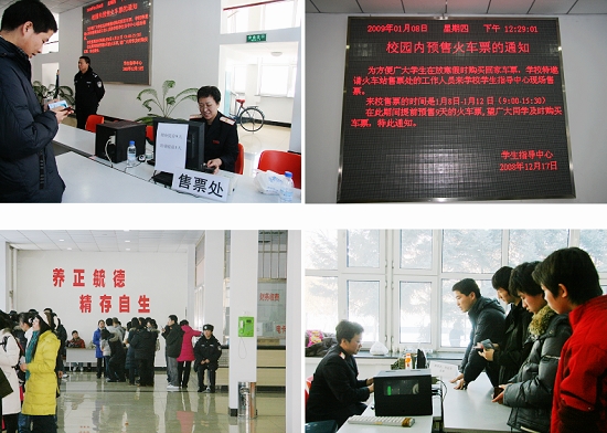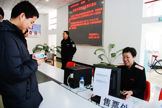 为解决学生购票难问题,方便广大学生在放寒假时能够及时快捷地购买到回家车票,学校于1月7日特邀齐齐哈尔火车站售票处工作人员来我校学生指导中心大厅现场预售学生返乡车票。现场集中售票时间为2009年1月8—12日(9:00—15:30)。在此期间,齐齐哈尔火车站为我校返乡学生预售9天的车票,受到了广大学生的热烈欢迎。