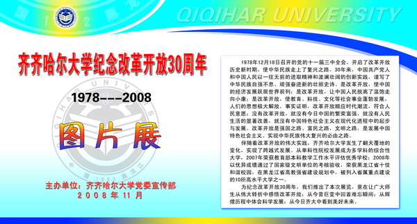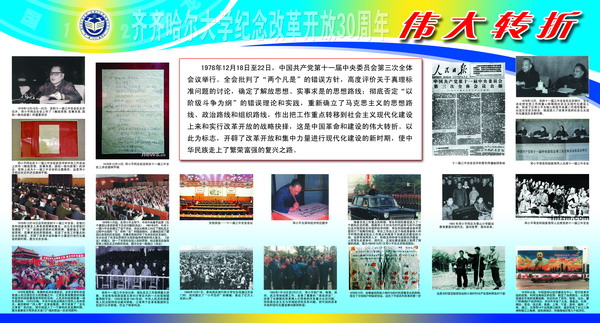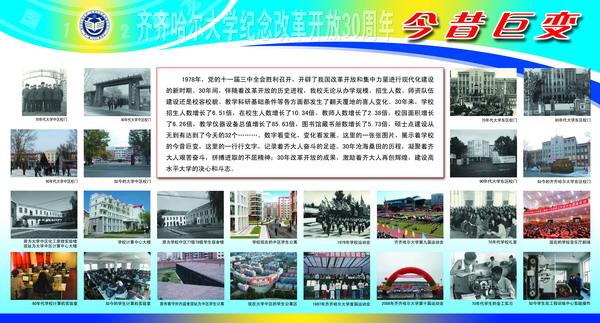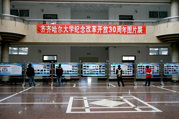 在纪念改革开放30周年之际,校党委宣传部在西区主楼阳光大厅举办了“齐齐哈尔大学纪念改革开放30周年图片展”。本次展览,意在让广大师生从伟大转折中感悟改革开放;从今昔巨变中回首难忘瞬间;从辉煌历程中体会科学发展;从今日齐大中看到美好未来。