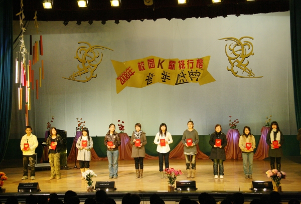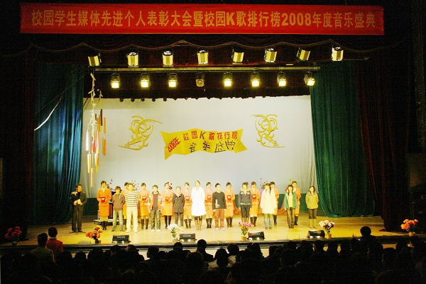 来自大学生记者团、广播台、青年报社、教育与传媒学院的50名获得表彰的同学上台领奖,千余名学生等参加了此次表彰会暨校园K歌排行榜2008年度音乐盛典活动。