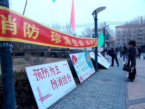 11月9日上午,在我校保卫处等有关部门和相关学生社团的共同努力与精心准备下,一幅幅鲜艳的消防宣传条幅及精美的宣传画张贴悬挂在校园的各主要干道上,营造了良好的宣传教育氛围。