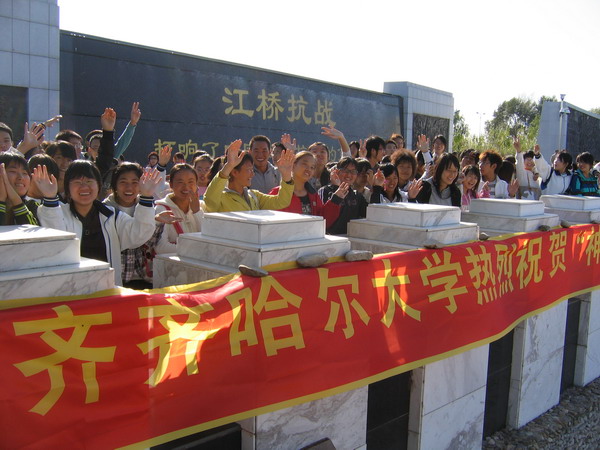 9月28日下午,齐齐哈尔市和平广场人头攒动,彩旗飘舞、锣鼓喧天。来自全市各界的代表及群众共3000余人士聚集于此,热烈庆祝神舟七号载人航天飞船成功发射,并期盼神舟七号胜利归来。广场上举行了万人签名活动,来自我校经管学院、化工学院、外语学院等300名同学在校团委老师的带领下,参加了本次活动。 活动在舞龙表演中拉开了帷幕,市委领导,各区代表及航天员家属分别致辞,表达了对神七的祝福。在随即举行的万人签名和丰富多彩的文艺活动中,欢腾热烈的气氛深深感染了在场的莘莘学子。