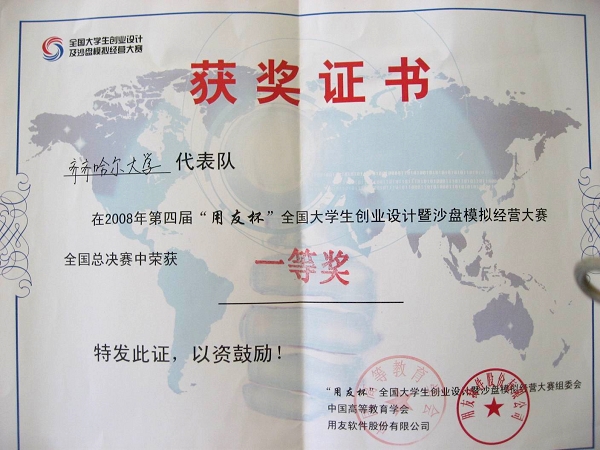 2008年7月27-30日,由中国高等教育学会和用友软件股份有限公司主办的第四届“用友杯”全国大学生创业设计暨沙盘模拟经营大赛全国总决赛在西安曲江国际会展中心举行。