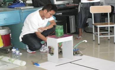 为筹备本次大赛,学校专门成立了领导工作组,由实践教学与设备管理处处长张德庆教授、计控学院副院长牛皖闽教授等担任组织负责人,计控学院电工电子实验教学中心主任尹明副教授等5名教师担任竞赛工作组成员。我校电工电子实验教学中心作为承办单位,为大赛提供实验场地,实验工具和元器件。我校最初有20多个队报名参加本届比赛,经过校内初选和最后的校内测试,最终选出3组优秀作品代表我校参加省内决赛。