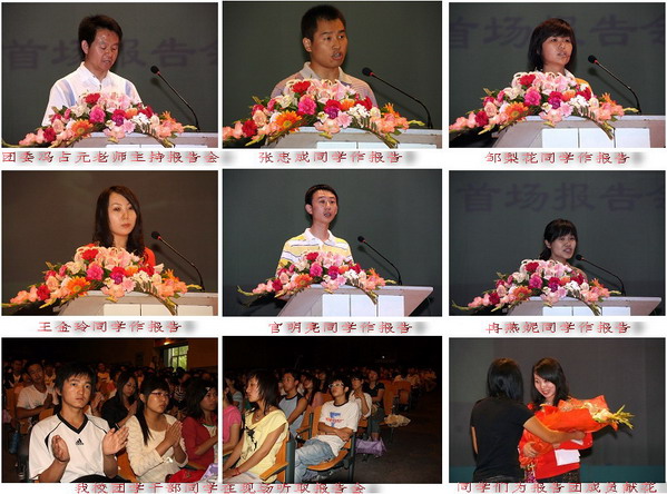 本期大学生“学习 实践 成才”报告团7名成员选自我校七个学院,其中5位同学为团校第七期团干部培训班的团学干部作了首场报告。报告团成员冉燕妮同学是今年我校赴四川、甘肃志愿服务10同学的代表。这些全校同学中的优秀代表,分别从不同侧面汇报了自己争当学习标兵、投身科技创新、勇于自立自强、志愿服务地震灾区等方面的感人事迹。他们以朴实无华的语言展示了我校大学生自强不息、奋发向上的精神面貌,体现了我校学生不断进取、为校争光的进取热情和努力成才、服务社会的高尚情操。他们的事迹为全校学生指明了努力方向,令人鼓舞,催人奋进。