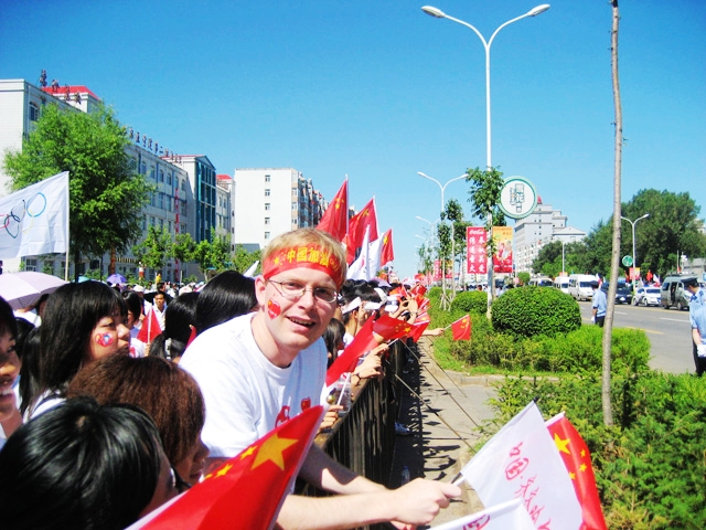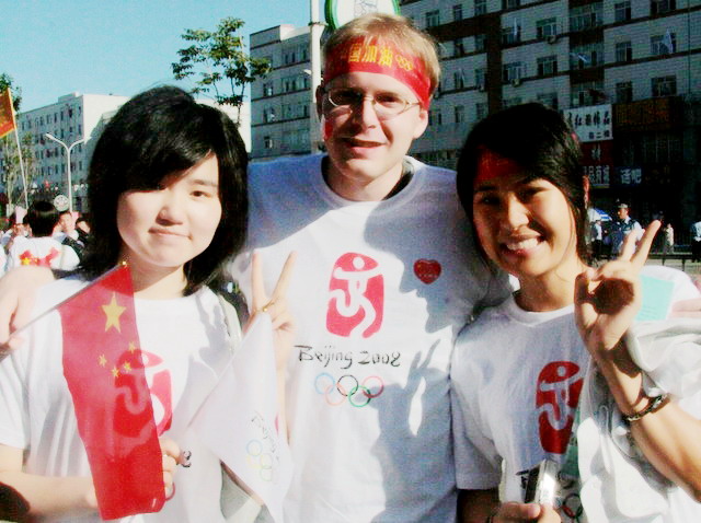 “同一个世界,同一个梦想。”我校外教Andrew(中文名朴安祖,简称安祖)来自澳大利亚悉尼,2007年8月在鹤城开始了他的中国之旅。按照外教值教一年以后可回国的原则,安祖在今年7月初就可以回国了。但为了亲眼观看圣火在鹤城的传递,他推迟了归期。13日早上6时许,安祖和几个中国朋友就来到了齐大东区迎接火炬的到来。他身着奥运T恤,手拿中国国旗与奥运会会旗,额上系着“中国加油”的小条幅,在观众中挥旗呐喊,并时不时用英语和流利的汉语说出“Good luck China !”“中国加油、奥运加油!”
