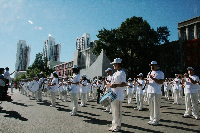 圣火点燃奥运梦想,音乐助威奥运盛会。在我校师生助威火炬传递的东区校门外的现场,由108名学生组成的大规模管乐队吹响号角,敲起锣鼓,为奥运加油。在迎接仪式上,他们演奏了《歌唱祖国》、《红太阳》等节奏欢快的曲目,表达喜迎圣火的喜悦和对北京奥运的美好祝福。
