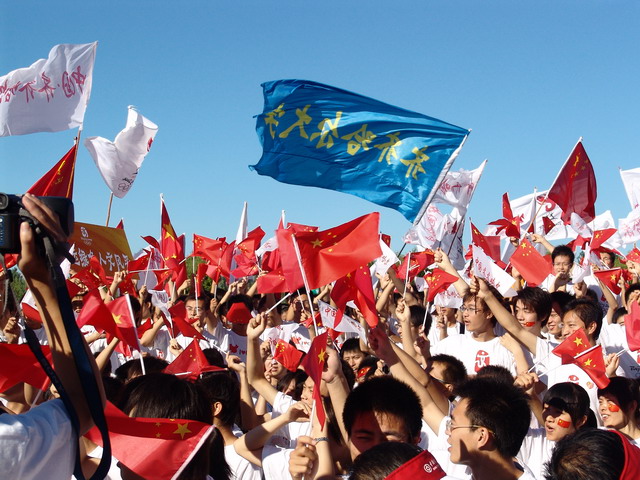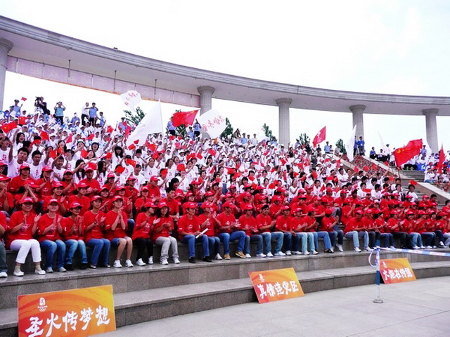 万余名师生热情为奥运火炬传递加油,不少同学脸上贴着“中国心”的标志,穿着印有奥运主题图案的文化衫,手中拿着各种各样的国旗、五环旗等小旗帜,翘首企盼着奥运火炬从自己身边经过的激动人心时刻……