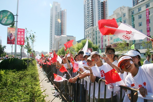 圣火传递旅途中,同学们一直对火炬手报以热烈的加油和欢呼,充分表达了齐大人支持奥运、支持北京的热情,展现了师生们热爱祖国、积极向上的精神风貌,表达了师生们希望奥运火炬在中华大地的手手相传中,也将和平、友谊和希望不断传递下去的良好愿望。