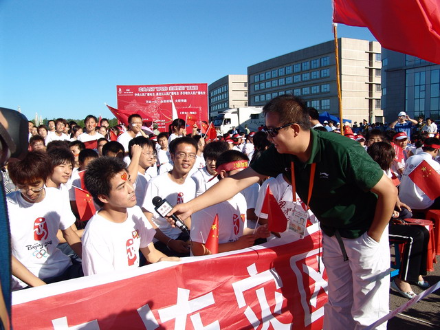在火炬传递起点仪式上,中央电视台记者对我校现场助威的机械工程学院的同学进行了采访。