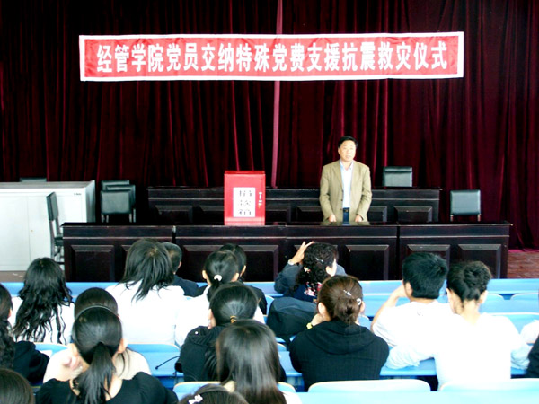 经管学院于24日在中主模拟法庭举行了党员交纳特殊党费支援抗震救灾工作的仪式。该院党委书记李玉山和经管学院全体党员师生一起,以交纳特殊党费的形式积极支援灾区人民的抗震救灾工作,向灾区人民表达了党员的赤诚之心。不到一个小时的时间,该院党员交纳特殊党费共计11200元。