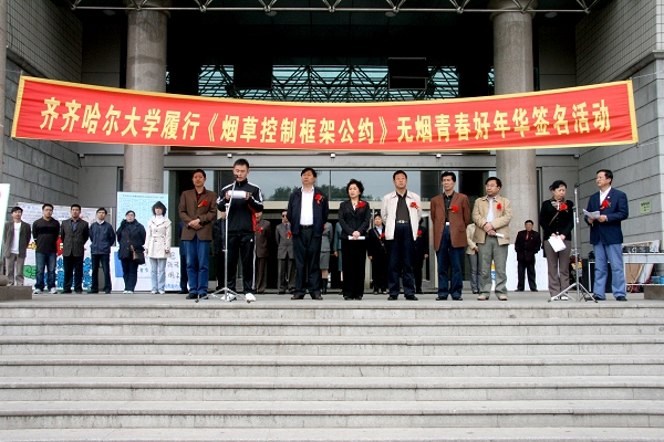 5月31日是第21个世界无烟日。齐齐哈尔大学履行《烟草控制框架公约》无烟青春好年华签名活动暨“无烟奥运 无烟青少年”系列活动启动仪式在西区主楼前隆重举行。齐齐哈尔市人大副主任王光、市政协副主席范天成、市爱卫会副主任侯丽娜、市社科联副主席张振华、市疾病控制中心主任、市控烟协会会长徐昆亭、市疾病控制中心健康教育所所长蔡军、校团委书记黄伟中、副书记李秀梅、学校团委工作人员及各学院团委书记、部分辅导员及1300余名学生参加了本次启动仪式。
