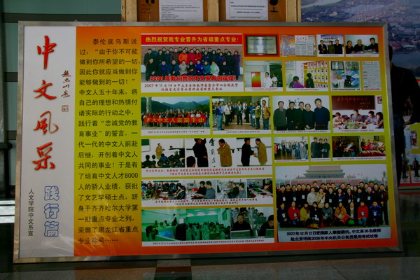 2006年,中文系第一个硕士点—文艺学学科诞生了;汉语言文学专业被评为省重点专业;全校第一个专业建设网络平台在中文系建成,教师的教学、科研环境得到极大改善;系务、教学与科研、学生工作等诸项管理实现了信息化,《齐齐哈尔大学中文系辉煌五十年风采录》出版发行……一系列丰硕成果诠释着中文人不平凡的耕耘与创造。