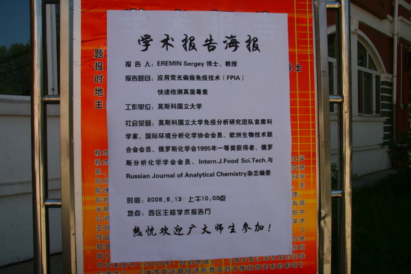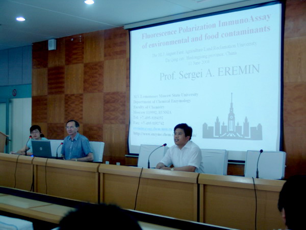 讲座在我校西区教学主楼学术报告厅举行,Sergey Eremin教授作了题为“应用荧光偏振免疫技术(FPIA)快速检测真菌酶素”的学术报告。
