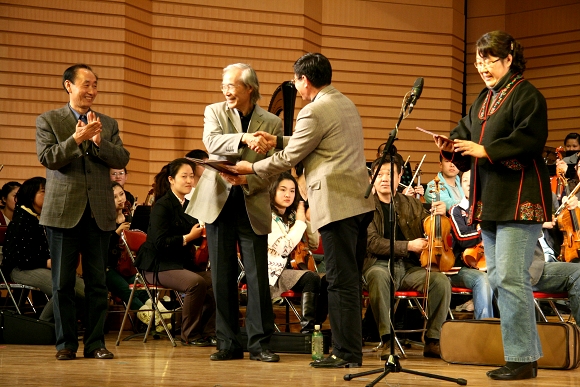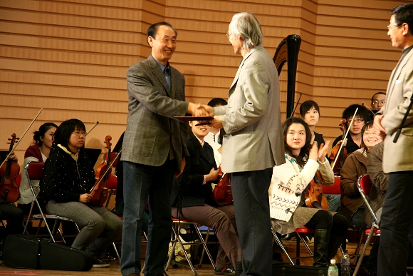 指导活动结束后,卞祖善先生欣然接受了我校的聘请,担任我校交响乐团名誉指挥、我校艺术学院客座教授。校长唱江华,校交响乐团团长、校工会主席吕晓辉分别向卞祖善先生颁发了聘书。在热烈的掌声中,卞祖善先生和在场师生亲切合影留念。
