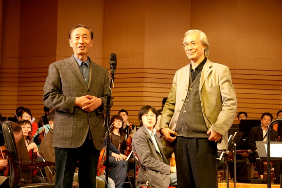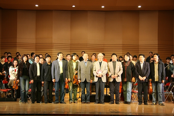 26日下午16时,唱江华校长陪同卞祖善先生来到我校音乐厅,受到了正在现场进行排练的师生们的热烈欢迎。唱江华校长热情地向在场师生介绍了卞祖善先生,并再次对卞祖善先生的到访表示热烈欢迎。卞祖善先生向在场师生发表了热情洋溢的讲话。在讲话中他对我校的热情接待表示感谢,并向在场师生畅谈了自己对研习了一生的音乐艺术的深刻感受,引起了师生们的强烈反响。