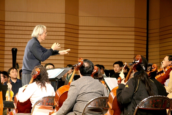 在观看了我校交响乐团的现场排练活动之后,卞祖善先生亲自登上指挥台,逐音部、逐章节地对乐团进行了艺术指导。历时两个多小时的指导过程,让台上台下的所有师生们真切地感受到了一位长者、大师精深的艺术修为,深厚的人格魅力和执着的专业精神。