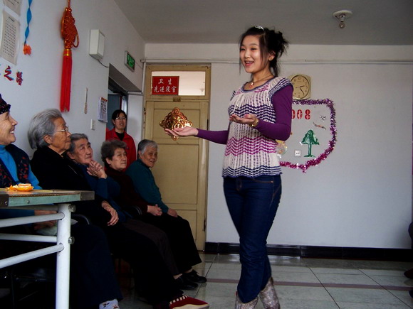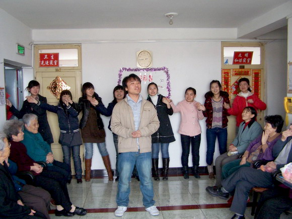 在新老联谊活动中,王琦博同学演唱了《我的祝福记得吗》、段丽娜同学表演了印度舞《天竺少女》等精彩的文艺节目,他们声情并貌的演出赢得了老人们的喜爱。