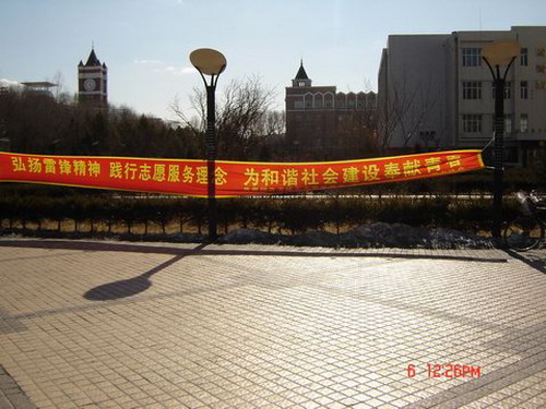 3月5日,我校青年志愿者协会分别在东、中、西三个区悬挂了宣传条幅,同时在电子宣传板上进行了宣传。各学院分别组织了丰富多彩的志愿服务活动,弘扬雷锋精神。