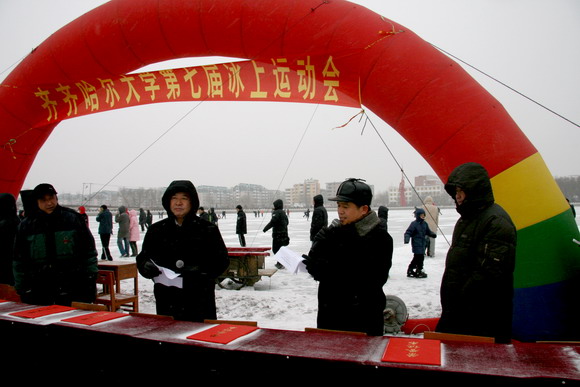 副校长曲伟建主持了开幕式并宣布“齐齐哈尔大学第七届冰上运动会比赛开始”;副校长郑喜群致开幕词;体育学院院长姚大为等数千名师生参加了开幕式并观看比赛。