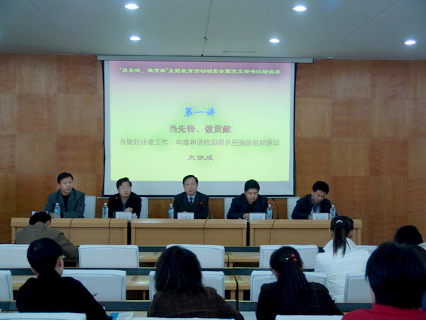 学校党委牢固树立“围绕中心抓党建、抓好党建促中心”的理念,高度重视主题教育活动,将其作为创建党建工作特色体系的重要措施。特别是2007年,学校接受教育部本科教学水平评估。充分发挥党组织和党员的作用,推动教学评建工作。党委在以往开展活动的基础上,根据当年的工作重点,在全校党组织和党员中开展以“当先锋、做贡献”为主题的教育活动,制定了实施意见,明确了活动的指导思想、原则、内容,要求通过主题教育活动的深入开展促进评建工作,通过评建工作情况来检验主题教育活动的实际效果。