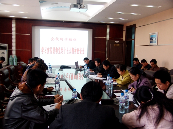 10月26日下午,由我校团委组织举办的全校团学组织学习宣传贯彻十七大精神座谈会在中区办公楼504会议室召开。校党委副书记王凤琴出席座谈会。校团委副书记李秀梅及校团委全体工作人员、各学院团委书记、各校级学生组织负责同学等20余人参加了座谈会。座谈会由校团委书记黄伟中主持。