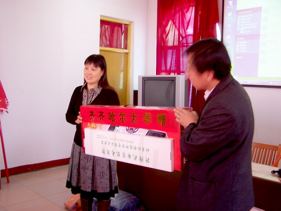 11:05,举行了捐赠仪式。我校经济管理学院为龙江县特殊教育学校赠送了电子琴、二胡、排球、学习用具等电教、文体用品。