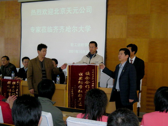 轻工纺织学院党委书记张晓慧、院长赵欣代表学院向天元公司段立民总经理赠送了“校企合作共谱华章 捐资助学德泽学子”的锦旗;向普昱公司刘贵宏经理赠送了“校企合作共谋发展设奖助学弘扬美德”的锦旗。