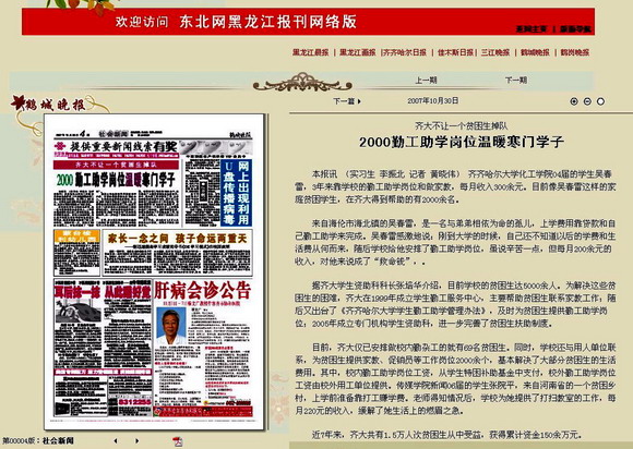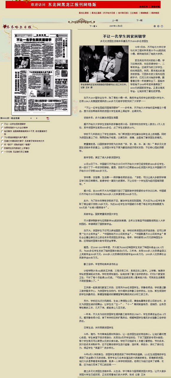 编者按:关爱贫困学生,构建和谐校园,是我校全面贯彻党的教育方针,坚持以人为本育人理念的重要举措。近年来,我校扎实的资助工作、良好的育人成效,赢得了社会的称誉。10月30日的《鹤城晚报》以《2000勤工助学岗位温暖寒门学子》为题热忱报道了我校支持和帮助经济贫困学生开展勤工助学工作的情况;11月6日的《齐齐哈尔日报》以《不让一名学生因贫困辍学》为题热忱报道了我校多元化贫困生资助体系所取得的良好成效。齐齐哈尔新闻网等媒体对报道情况给予了转载。
