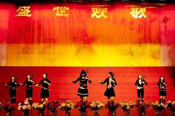 从10月23日至11月5日,艺术学院音乐表演系近百名师生在系主任包明德等指导老师的带领下,先后深入到齐市十七中、铁锋区供电局、65447部队、65448部队、民族中学与朝鲜中学、梅里斯达翰尔族中学、杜尔伯特红旗小学等单位,为企事业单位职工、中小学师生、军营官兵、少数民族同胞、社区和农村群众连续演出11场,在龙江大地上掀起了一股如火如荼的文化热潮。师生们用自己扎实的基本功、精熟的业务素质和高水准的演出效果为各界观众送去了一场又一场精彩的文艺节目,充分展现了新时期新一代文艺工作者的精神面貌,体现了我校在不断推进教育教学改革、深入开展素质教育中所取得的丰硕成果,表现了齐齐哈尔大学努力服务地方经济文化建设的决心与行动。