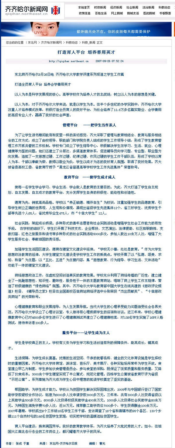 编者按:9月26日,《齐齐哈尔日报》刊发“齐齐哈尔大学教学评建系列报道之学生工作篇”:“打造全员育人平台培养会学善用英才”。