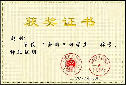 我校机械033班赵刚同学在2007年8月第九次“全国三好学生”、“全国优秀学生干部”和“全国先进班集体”评选表彰活动中喜获“全国三好学生”称号。黑龙江省高校获得“全国三好学生”和“全国优秀学生干部”荣誉称号的仅八人。