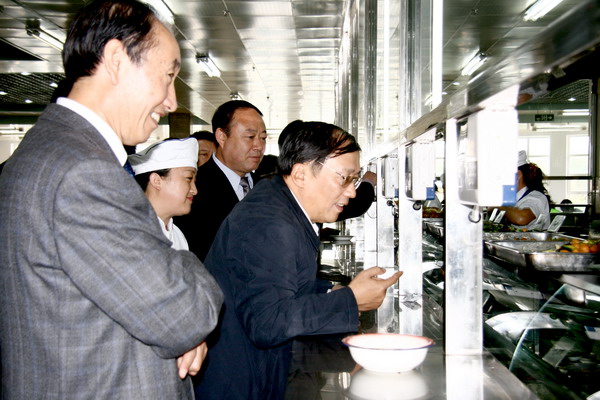 然后,他来到服务窗口,认真地察看了学生餐厅的主副食供应情况。当他看到学生餐厅的午餐主食和菜品种繁多、物美价廉时,连声说“好”,并手持我校师生日常就餐使用的“校园一卡通”加入到午间购餐的队伍中。在服务窗口,他用“校园一卡通”打了一份菜和几两米饭,然后端着走到了正在就餐的学生中间,与他们一起共进午餐。