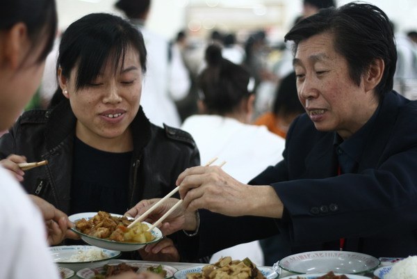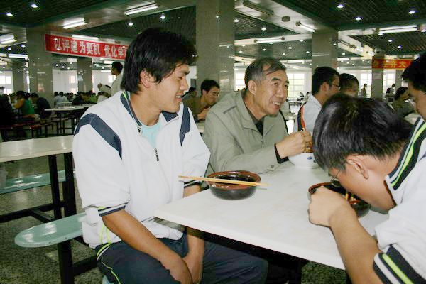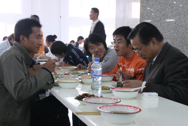 当学生们看到专家也来到餐厅就餐时,都抱以微笑,并主动向专家问好。专家们边吃边和同学们亲切交谈,了解他们的学习、家庭、生活等情况。