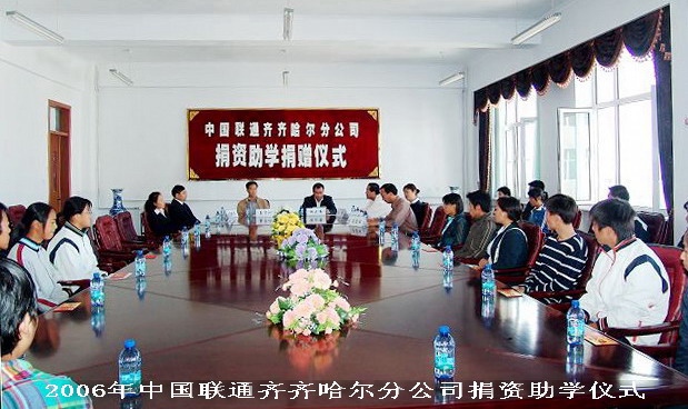 中国联通齐齐哈尔分公司尊重知识、尊重人才,在积极发展企业的同时,重视培养人才,关爱弱势群体,大力弘扬“以人为本、构建和谐”的企业文化。当公司领导得知我校一些品学兼优的贫困学生在无任何资助的情况下难以完成学业的时候,他们以心系社会的热情积极地做出了反响。