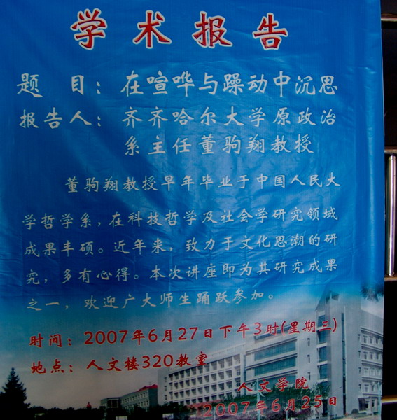 6月27日下午3点,人文学院在人文楼320教室邀请原政治系主任董驹翔教授为师生们做了题为“在喧哗与躁动中沉思”的精彩学术讲座,受到了师生们的好评与欢迎。