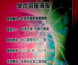 沈教授的报告主要从化学纤维科学与生产两个方面讨论了化学纤维的发展趋势;材料的功能与性能;功能纤维的开发途径与技术。此次报告使学生了解了国外关于化学纤维的发展方面的前沿知识,激发了研究兴趣,受到了同学们的好评与欢迎。