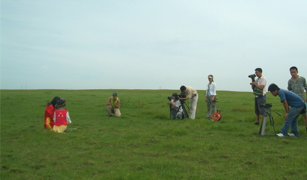 8月11日,是他们开机拍摄的第一天。他们早早地起床,驱车一多个小时才到达第一个拍摄景点,对莫日根姐姐进行拍摄。为了摄取更多、更好的画面,他们常常奔波在几个景点之间。有时,也会为景点的选取进行反复地讨论。摄制组师生深知光线选择对于摄影作品的重要性,于是他们在光线的选择上很下工夫。每天10点半以后光线太强就不适合外景拍摄了,他们就把拍摄时间选在早晨和下午,把晚上和中午的时间用来策划和制作。每天早上4点起床,他们就一直要工作到晚上12点才能睡下。中午,实在困极了,就在车上或者简陋的会议室里躺一会儿。