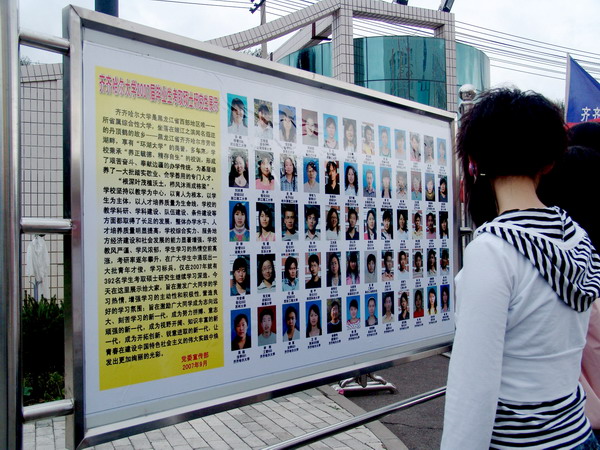 环湖大学育俊才,考研学子展风采。9月7日,校党委宣传部分别在东、中、西三区推出“齐齐哈尔大学2007年考取硕士研究生同学展示”专题展板,以图文并茂、生动鲜明的专题展为载体,将我校考研学子风采一一展示给广大师生。