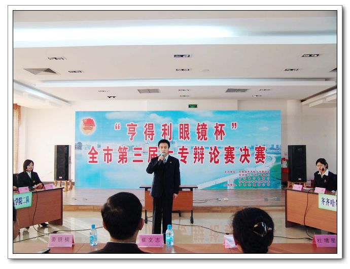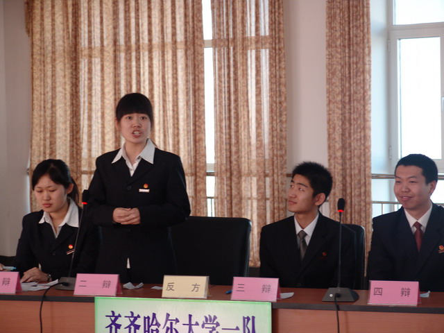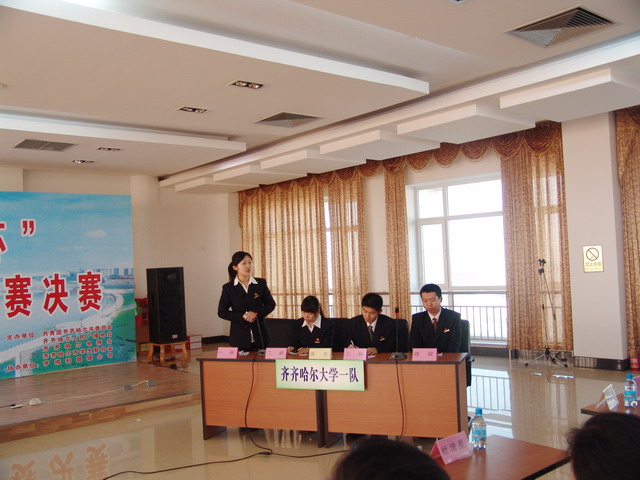 决赛上,我校由人文学院04级广姜俊、张玉华,理学院04级林翔,生命学院04级崔学等四名辩手组成的第一代表队与齐齐哈尔职业学院第二代表队争夺冠、亚军。