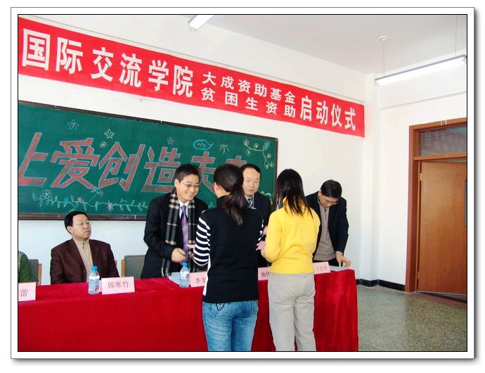 2006年12月27日下午,在新年来临之际,我校国际交流学院在西区教学主楼406室隆重举行了“大成资助基金”启动仪式。