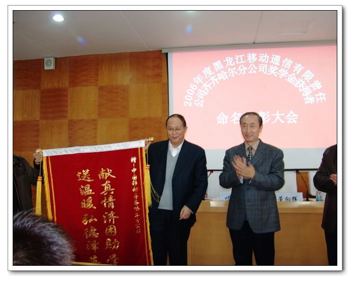 校长唱江华、副校长姜守训代表学校向黑龙江移动通信有限责任公司齐齐哈尔分公司总经理董向辉赠送了写有“献真情济困助学子,送温暖弘德泽英才”的锦旗。